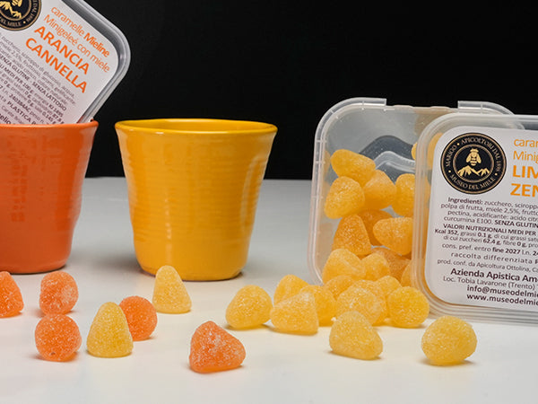 Caramelline al miele con limone, zenzero, arancia e cannella e liquirizia, 3 gusti gustosi. Realizzate con prodotti di origine naturale e provenienza selezionata. Per la realizzazione delle caramelle vengono utilizzati ingredienti di prima qualità, come ad esempio estratti di piante officinali, succhi di frutta, oli essenziali e naturalmente miele.