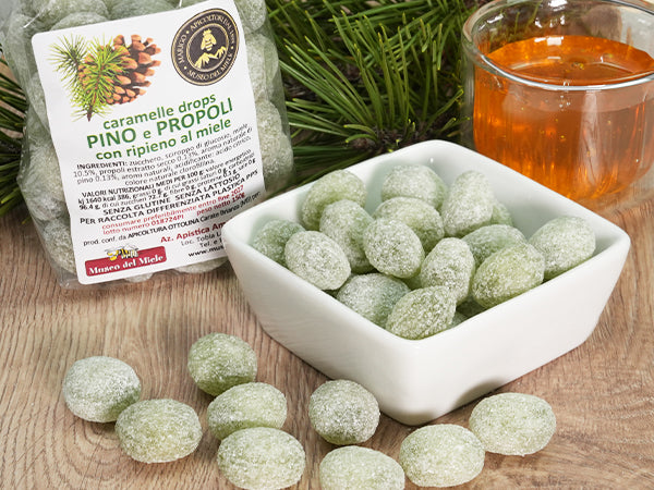Caramelle con ripieno al miele disponibili in diversi gusti, fra cui pino, propoli e miele. Le nostre caramelle “drops” (gocce) dal cuore morbido sono una golosa fusione di miele ed estratti naturali aromatici, perfette per una dolce pausa in ogni momento della giornata.